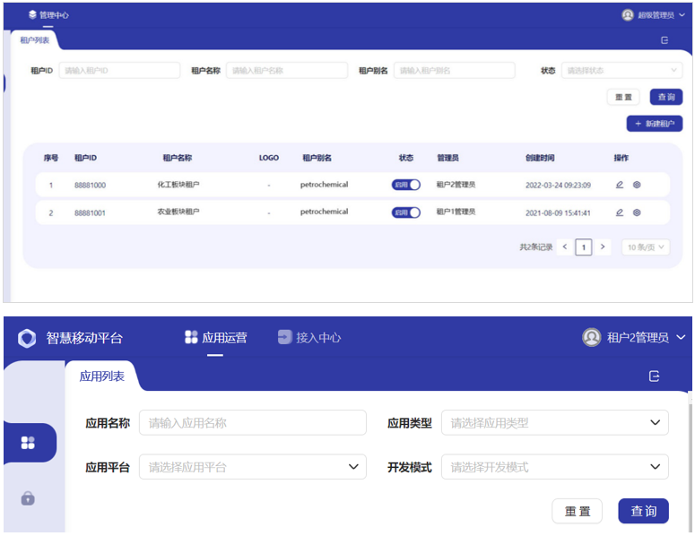 支持多租户管理,针对大型集团化企业,多业态的经营模式下,信息化管控也是呈现出多维度的管理要求,所以多租户的方式为集团化企业的运维管理提供了更细致维度的管理权限分配与控制