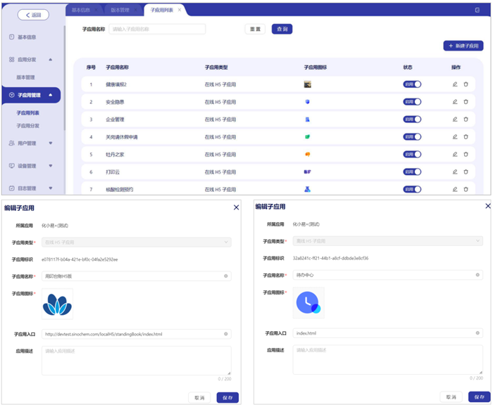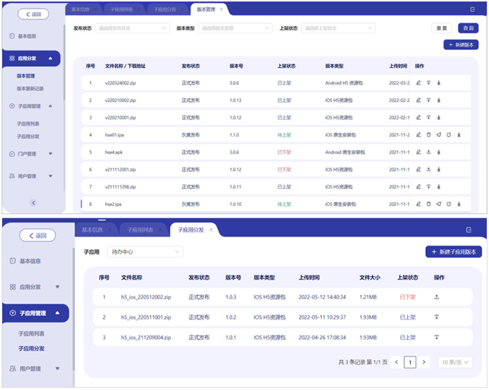 ● 在平台中发布管理支持应用的 APP 安装包版本管理、子应用版本管理