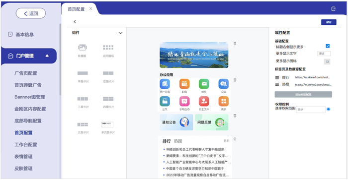 门户首页配置,支持根据不同组件,组合配置生成综合的门户首页,包括轮播图、功能按钮区域、单图、多图,多页签内容卡片,等等形式的布局内容。