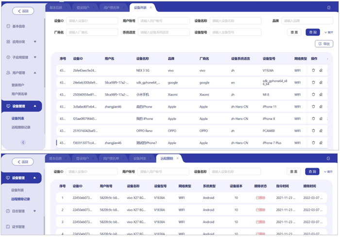 ● 设备管理中可以对设备信息进行记录、查询,包括获得设备的网络、型号、系统等信息