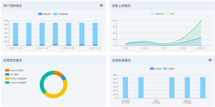 运营管理服务平台包含多维度的统计分析功能,包含:装机量与活跃用户、用户访问量趋势、操作系统使用情况、网络使用情况。同时移动平台还会根据客户端运行情况,记录访问日志,行为收集服务引擎支持自定义事件收集接口,开发人员可以根据统计分析需求在任何需要采集信息的地方,通过调用接口采集用户更详细的信息数据。